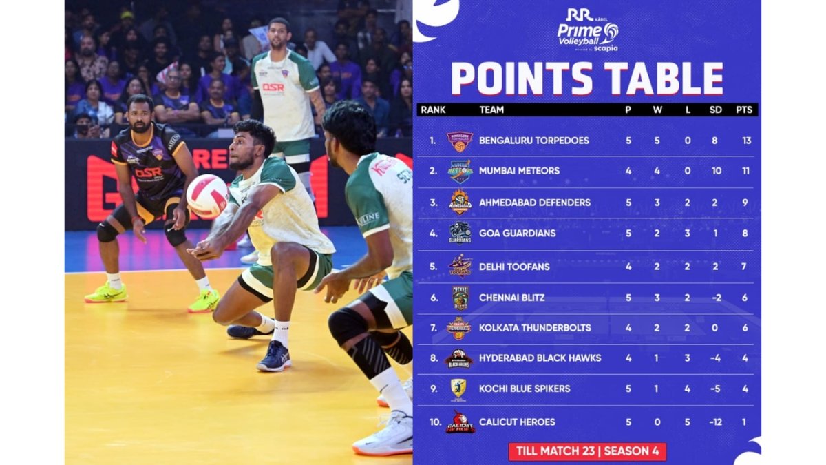 Hyderabad (Telangana) [India], October 16: Bengaluru Torpedoes outlasted the Calicut Heroes 20-18, 20-18, 7-15, 11-15, 15-12 in a five-set thriller at the Gachibowli Indoor Stadium in the ongoing RR Kabel Prime Volleyball League powered by Scapia. Calicut’s Shameemudheen was honoured as Player of the Match for his resolute defensive performance.