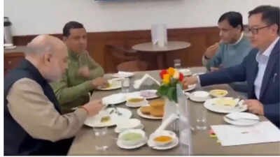 NEW DELHI: Union home minister Amit Shah on Tuesday was seen having a meal with his parliament colleagues in the Parliament canteen.Shah was joined by Union MoS Nityanand Rai, Union minsiter Kiren Rijiju and BJP MP Anil Baluni.