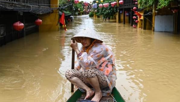 A woman rows a boat on a flooded street following heavy rains in Hoi An, Vietnam on October 30, 2025. AFP