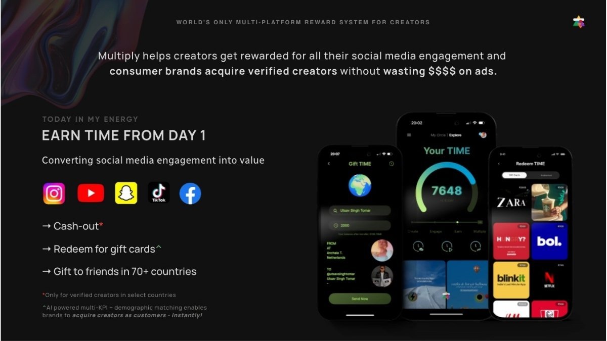 Multiply is built to answer this question with a core principle: Effort Deserves Acknowledgement. On Multiply, creators are rewarded for the engagement they generate starting from day one, without waiting for virality. By connecting their social profiles, creators accumulate TIME (Today In My Energy) through engagement on Instagram, YouTube, TikTok, Facebook, and Multiply. TIME can be redeemed for brand vouchers, gifted to friends worldwide, or cashed out in select countries. It is simple, powerful, and deeply motivating.