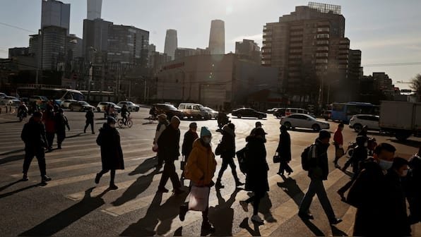 People cross a street during morning rush hour in front of the skyline of the CBD in Beijing. Representational image/Reuters