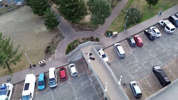 A drone view shows suspected shooters lying on a pedestrian bridge, following a shooting incident at Bondi Beach, in Sydney, Australia, on December 14, in this screengrab obtained from a social media video. Image courtesy: @bonusik28 via X/via Reuters